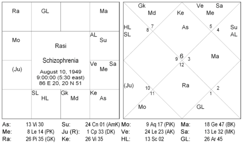 The subject became the president of a dramatics association and organized a play. On the first day of the production, a fire broke out in the theatre, which burned the sets completely. This occurred in Jupiter Mahadaśa, Venus Antardaśa and Cancer Narayana Daśa. In a week’s time, the native began to show symptoms of schizophrenia and resigned from his job as a private secretary in a good company. Soon after, the native became completely mad and he still suffers from schizophrenia. The mana continues to be tormented.
