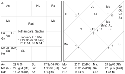 This is the horoscope of a politician in India. The fifth house is in the Sātvik, benefic, even and feminine sign of Cancer, with the female planet Moon strongly placed in its own Rasi. This is a clear indication of devotion towards female deities, in particularly Goddess Gouri, who is the ultimate form of the Divine Mother. She is in fact, one of the greatest devotees of the Devi or the Divine Goddess. Her devotion is so great, that despite being a renunciate; she has herself assumed qualities of motherhood and has established many orphanages. Here Moon is also the Bhrātṛ Kāraka, and its placement in the fifth house is considered most auspicious, showing a total dedication to her guru. She draws her strength from her guru and the mantras received from him.