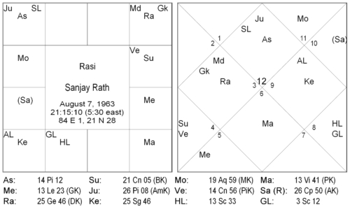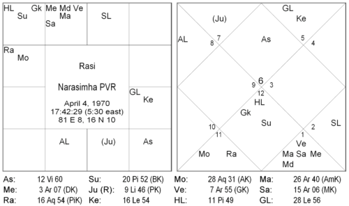This is the chart of a SJC guru, where one finds the fifth house to be empty, but the fifth lord Mars is placed in the 8th house in a powerful combination with three planets, Saturn, Mercury and Venus. The fifth house is in the sign of Capricorn, which is a feminine and an even sign, with its lord Saturn, a neutral planet. The deity the native is much attached to and worships regularly is Mahālakṣmī, represented by Venus. Venus also represents his ishta, being the 12th lord from the Kārakāmśa and conjoined with his Ātmakāraka, indicating a high level of spirituality and a special personal connection and devotion, which he feels towards Mahālakṣmī. Of the other planets, which conjoin the fifth lord, Mars is prominent, strong in his own sign Aries. In his childhood, the native was particularly attached to Hanumān. The third indication is that of Lord Nārāyana (Saturn) and Viṣṇu avatārs (Mercury in moveable sign). It is a well known fact in SJC circles that the native regularly conducts the Satyanārāyaṇa Vṛata at his home in the US. Given the strong presence of Mars in Aries, the avatār who is firmly indicated is Lord Nṛsimha. In fact, interestingly, relatives from his father’s maternal side were such devout worshippers of Lord Nṛsimha, that almost the entire clan was named after the deity in a variety of combinations, such as Ugra Narasimha, Jwala Narasimha, Lakshmi Narasimha, Vijaya Narasimha etc. His grandfather was also named Narasimha Rao, like the native himself. (Close involvement of 9th lord and 5th lord shows father’s lineage). As a consequence of this family background, the native worships Lord Nṛsimha but is not particularly attached to the deity. The Viṣṇu avatār towards whom he feels great devotion is Śrī Rāma, following Hanumān and Goddess Mahālakṣmī.