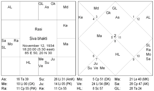 In this horoscope, the fifth house has no planets. The fifth lord Mercury is conjunct the Sun, Jupiter and lagna lord Venus. The strongest planet conjoining the fifth lord is the Sun, the Amātyakāraka, depicting Shiva worship. Jupiter also portrays worship of Shiva. The native is a great devotee of Shiva, and such is the extent of his devotion, that he recognizes no other deity. For him, there is only one God, one Creator, one Lord of the Universe, and that is Shiva. In an extreme corner of his spacious villa, he has his own private Shiva linga, immersed in a small pool of water, where he sojourns early each morning with his basket of flowers. None of the other family members ventures near the Linga, over which he exercises exclusive proprietary rights. Bare bodied, clad only in his dhoti and huge rudrākṣa beads, he worships his favorite Shiva with freshly plucked flowers, his chanting of Om Namah Shivaya reverberating across the house for all to acknowledge his reverence for the great lord. The relationship that he shares with his god is one of a child with a parent, of a friend with a confidante; alternating in gratitude or anger depending on the turn of events that fate had dealt him at a particular time. This profound single minded devotion towards one deity, almost to the extent of dissolving the self with the divine being can be seen in the conjoining of the 5th lord and the lagna lord with the Sun and Jupiter, implicating that the self (lagna lord) and bhakti (5th lord) had merged with Shiva (Sun and Jupiter).