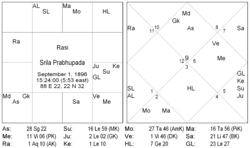 In Srila Prabhupada’s chart, the fifth house has no planets. The fifth lord Mars is conjoined an exalted Moon. The fifth house is a masculine and an odd sign, with the fifth lord being a male planet. Hence, Mars conjunction with Moon, rather then depicting a female deity, indicates more towards a male god. Exalted Moon can be none other than Sri Krishna. The dispositor of the fifth lord Venus is with Mercury, which also indicates Krishna, and the conjunction of Venus and Mercury point towards a love for Radha and Krishna. However, undoubtedly, the fifth lord’s conjunction with the exalted Moon shows his single minded focus on one god, in this case Krishna.