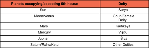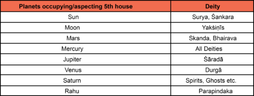 Inferring from the above mentioned principles, the śāstras provide a list of the deities corresponding to the nine planets, if placed in or associated with the fifth house. Given below are two such correspondences as mentioned in the Jātaka Pārijāta (henceforth JP) and the Jātaka Tatva (henceforth JT).