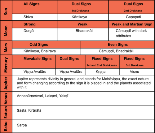 Many jyotisha works first examine the nature of the fifth house and the influences on it to determine the deities to be worshipped. The most common dictum that is found, is that if a male planet is placed in or aspects the fifth house, the subject will worship a male deity and if the planet is female then the object of worhsip will be a female deity[2]. If there are no planets in the fifth house, then the fifth lord is examined, its nature being determined by the planets with whom it is conjoined. This basic dictum has been further elaborated by different scholars, according to the gender and maleficence of planets and the gender, oddity and fixity of the signs, from which we may derive the following: