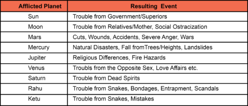 From the above it is clear, that the association of malefics with the fifth house cause affictions in the mind and pushes the subject towards tantrik mantras. However, even benefics, if weak, debilitated, retrograde or severly afflicted can often give similar results as under such condiitons they constitute a curse from the past life. During the periods of such afflicted benefic planets great evil shall befall and the subject may start dabbling in tantrik mantras or black magic and mantras of shudra devatas. This will cause further suffering as such mantras allow evil thoughts to continue in the mind. The following events will happen during the periods of the affected planets, indicating forthcoming curses that will manifest[4].