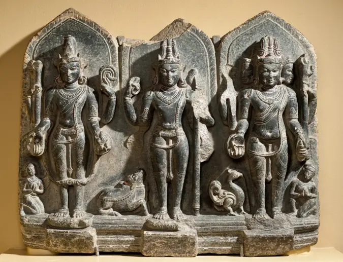 The unmanifest Brahmaṇ is Vāsudeva and as his creative impulse, his śakti assumes three hues according to the guṇas associated with them. It is as if each śakti activates a particular guṇa and then riding it is manifested. The three śaktis are Śrī Śakti, Bhū Śakti and Nīla Śakti and they respectively activate the satva, rajas and tamo guṇas. Vāsudeva is therefore saguṇa now and his three amśas which are replete with the guṇas and the śakti are known as Aniruddha, Pradyumna and Saìkarṣaṇa. Parāśara has visualized this process as a quadrant, probably a precursor to his later thoughts on the kendras, or probably to the scriptural reference of Narayana as connected with all that is associated with the number four. Of the quadrant, one quarter is Vāsudeva as the unmanifest Absolute Brahmaṇ, while the other three quarters are his manifest, saguṇa selves as Aniruddha, Pradyumna and Saìkarṣaṇa[2]. Brahmā, Viṣṇu and Śiva are the ahaṇkāra mūrtis of the three guṇas. United with Śrī śakti he is Viṣṇu and sustains the universe, with Bhū śakti he is Brahmā and creates the material world and with Nīla śakti he is Śiva and destroys all creation at the time of pralaya. Vāsudeva and his śaktis are also known as Puruṣa and Prakṛti, with Puruṣa representing the latent, eternal aspect and Prakṛti the changing and ever-evolving flux constantly manifesting herself in differing ways.