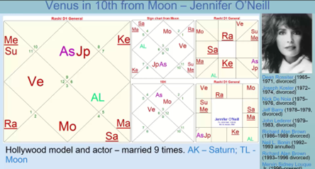 This is another Hollywood model and actress Jennifer O’Neill, again married nine times. Here Śukra is exalted, how lovely, in the 10th from Moon. But actually, it is in the 4th from Moon, so it becomes very strong, it is in digbala – nine marriages.