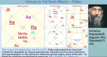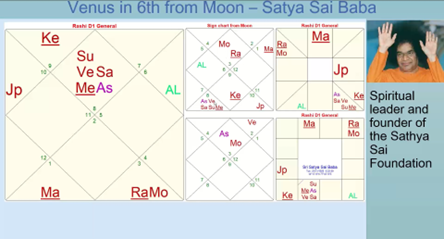 Then you can see placements of Venus being in the 6th house from the Moon. When Venus is in the 6th house from Moon then in reality it is coming to the 12th house from Moon, high point of desire is in 12th from Moon. Here you can see it in the chart of Satya Sai Baba – rejecting Venus.