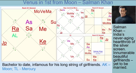 Here is another Indian very well-known film actor called Salman Khan. This man is the hot top, and all the beautiful women were his girlfriends, including the previous horoscope – they also had a relationship. He is in his mid-50s, but he is still unmarried, and he is famous for all these huge amount of relationships that he had. You can see Moon, Mars and Venus together, and again we are having Venus in the 7th from Moon.