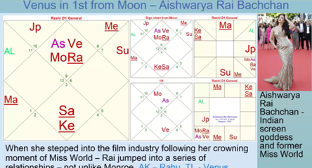 This is another case of Venus in the first house from Moon. This is the chart of Aishwarya Rai Bachchan, a screen goddess from India, and she was also the former Miss World. Aishwarya Rai is extremely beautiful but when she stepped into Bollywood that is the Indian film industry, so beautiful, so desirable, she had many relationships.