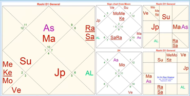 We also find this combination in the horoscope of Śrī Śrī Ravi Shankar. And in this case Śukra in 2nd from exalted Chandra, in reality, is falling into the 8th house, total sadhu Śukra, total brahmacharya.