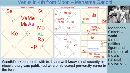 This chart is of Mahatma Gandhi, one of the pioneers of India’s national movement and a very famous political leader. He is Tula lagna, Moon in Karka, he has Mālavya[8] Mahāpuruṣa yoga, though Venus again is afflicted by malefics (conjoins Mars and Pāpa kartari from Saturn and Sun). His Chandra is also very powerful in own sign, 10th lord in the 10th house. And that Śukra is in 10th from Chandra – it means these people revel in the arms of women. You would say that he was an ascetic kind of person, which he was but he wrote this book called “My experiments with truth”, where he said that in order to test his brahmacharya he would sleep in a roomful of naked women, roomful meaning his nieces, you can see them on picture. Recently, one’s of these nieces diaries got published, and there she has written all details about how he would make these girls, two nieces and another one, who is a doctor, he would make them sleep with him, he would fondle them; then he would make one of the doctors take a bath and watch her as she was taking a bath and apply soap on her… Very perverse life, but sexuality is a very different thing, the sexual desire or the desire for love, these are all very different things. You can see that Venus in 10th from Chandra, nobody escapes this.