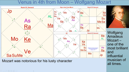 This horoscope is of the famous composer Wolfgang Amadeus Mozart. They said that Mozart was a very lustful person, and he had many relationships and he died at a very tender age of 30s (just like Marilyn). Debilitated Moon is in Scorpio, in digbala; Venus again is in the 4th house from the Moon, which means Venus is really coming into the 10th house. These people revel in the arms of the opposite sex; they revel in it.