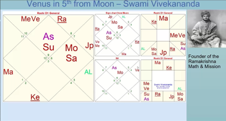 Chart of Swami Vivekananda has Dhanu lagna, Śukra is in the 2nd house, Moon in the 10th house, there is a Siṁhāsana yoga etc., but from Chandra lagna – Śukra beautifully placed in Karka but in 11th from Chandra.