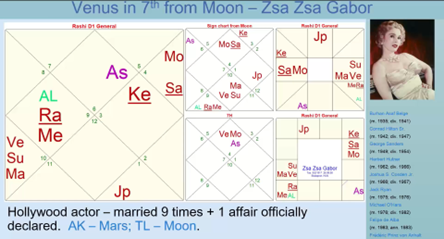 So, if either Venus and Moon are together or Venus is in 7th house from the Moon by this calculation then that desire is extremely strong. And Zsa Zsa Gabor was married nine times, and she had umpteen number of relationships which are not quoted and talked about. And her Tithi lord also happens to be Moon. So, she got challenged to emotions and the things concerned.