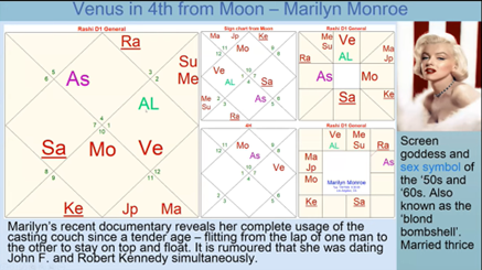 This is the chart of the famous screen goddess and the sex symbol of the 50s and 60s, the ‘blonde bombshell’, the very beautiful Marilyn Monroe who was married three times. She is Karka lagna with the Moon in the 7th house which itself is a very strong jala thing, and from Chandra lagna Śukra is placed in the 4th house which is a kendra placement.
